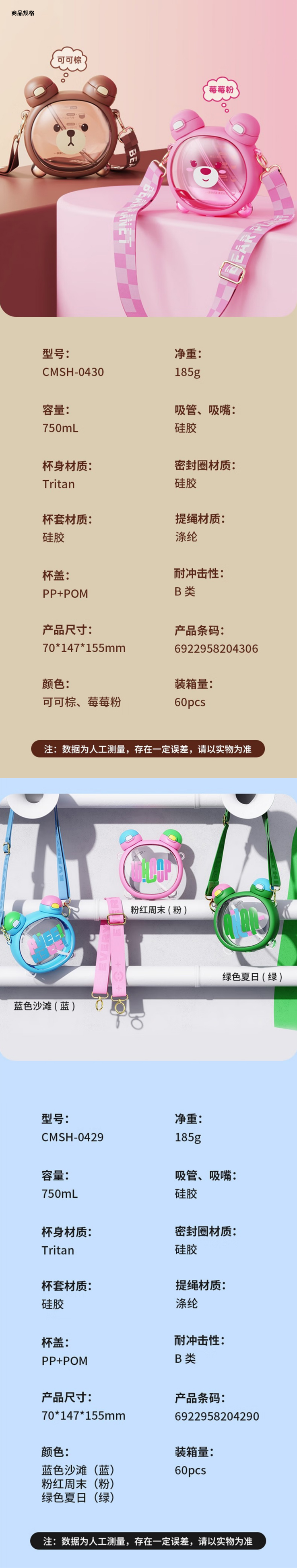 草莓生活小熊儿童水杯上学专用双饮吸管杯750ML儿童水壶定制起订量: