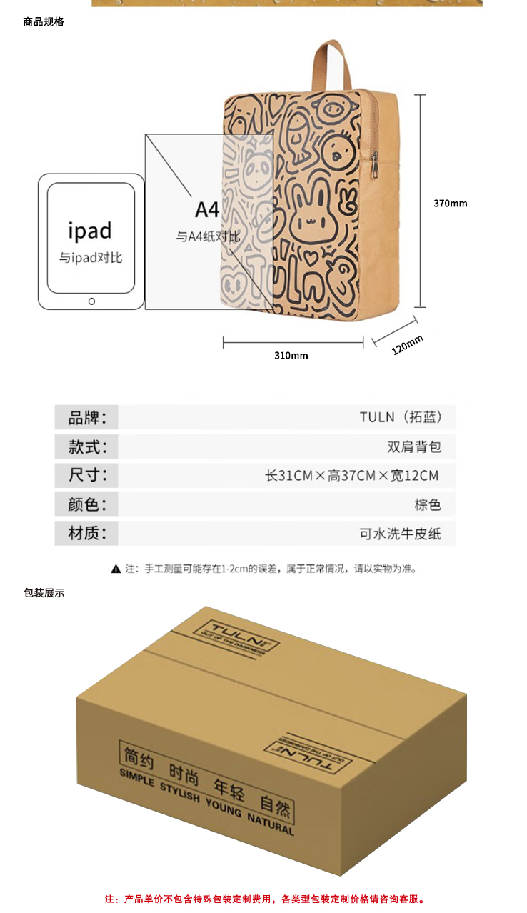 拓蓝(TULN)梵音牛皮纸背包 TD1CA02036(512)动物乐园双肩包定制起订量:
