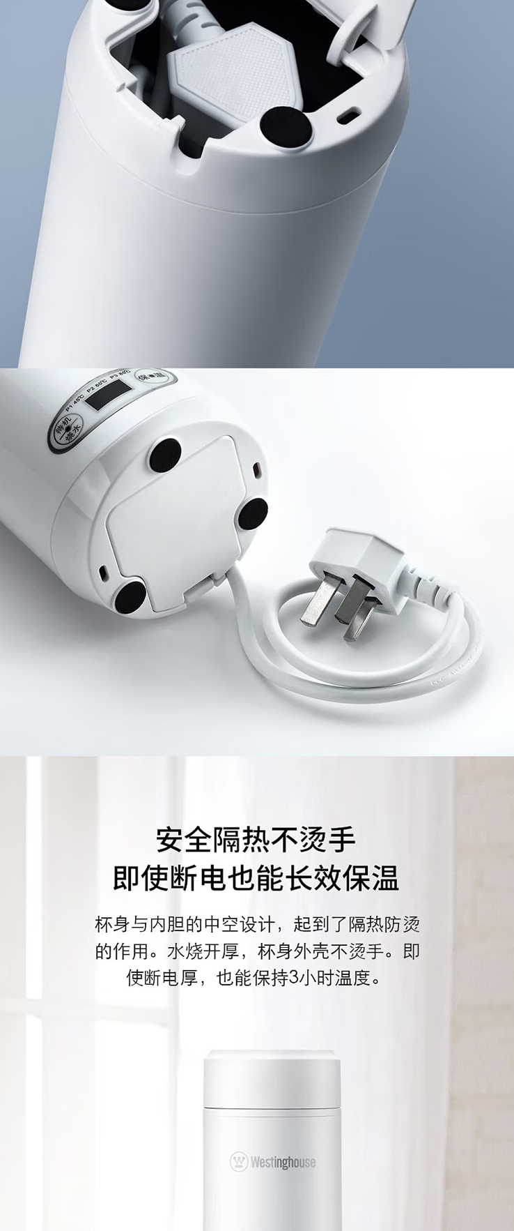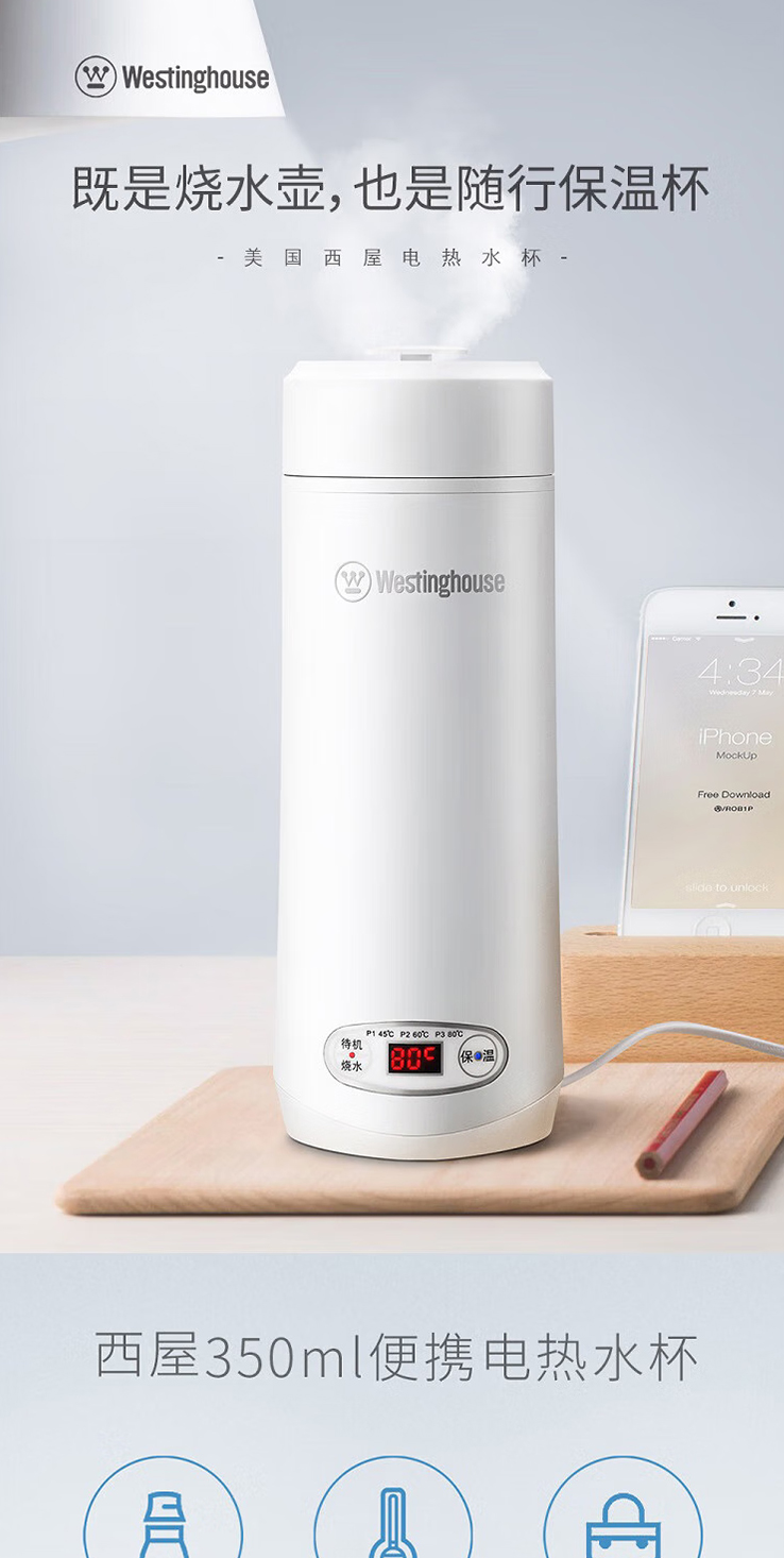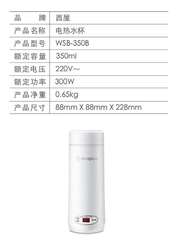 西屋(Westinghouse)便捷式电热水杯WSB-350B家用自动断电开水壶泡茶专用烧水器定制