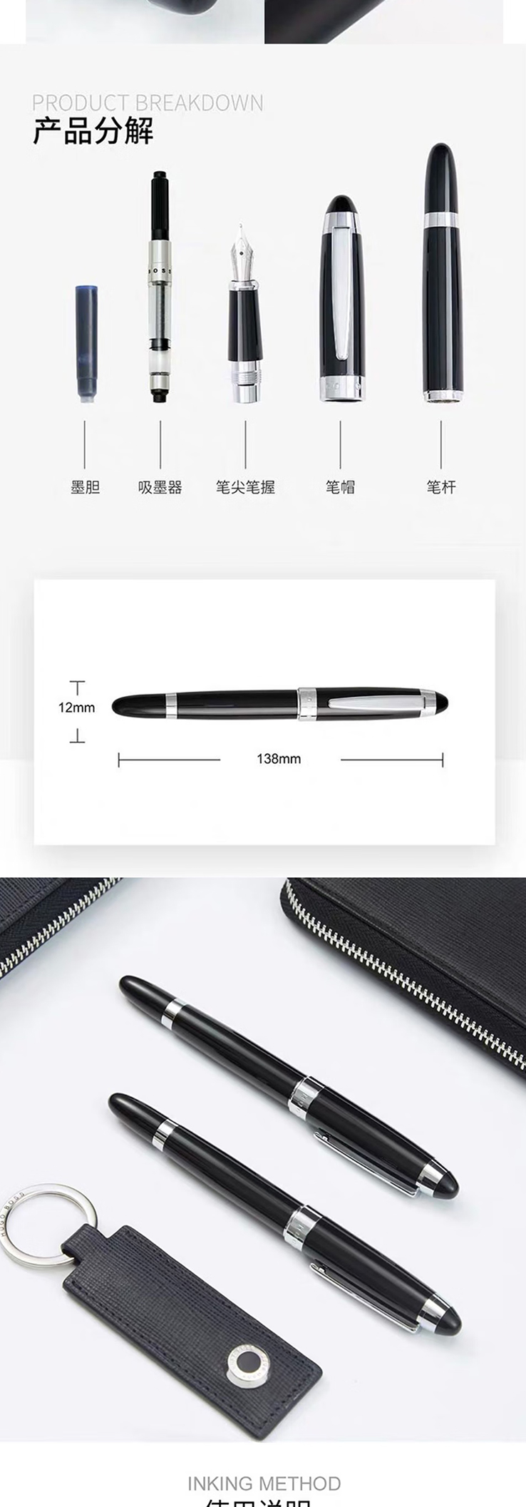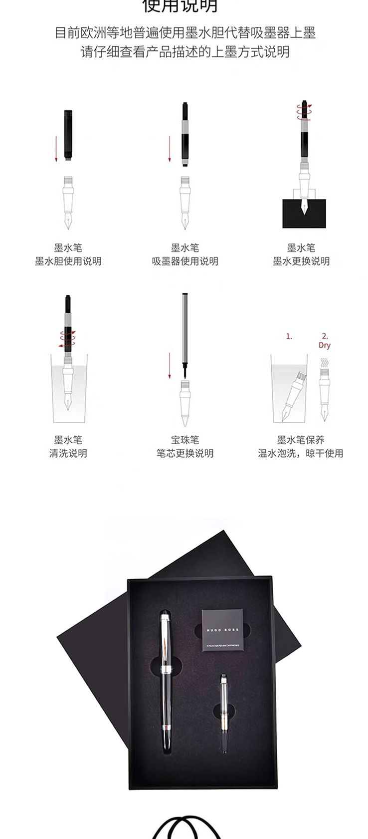 HUGO BOSS标志系列黑色钢笔墨囊吸墨器礼盒套装 商务礼品高端颜值墨水笔套装定制起订量: